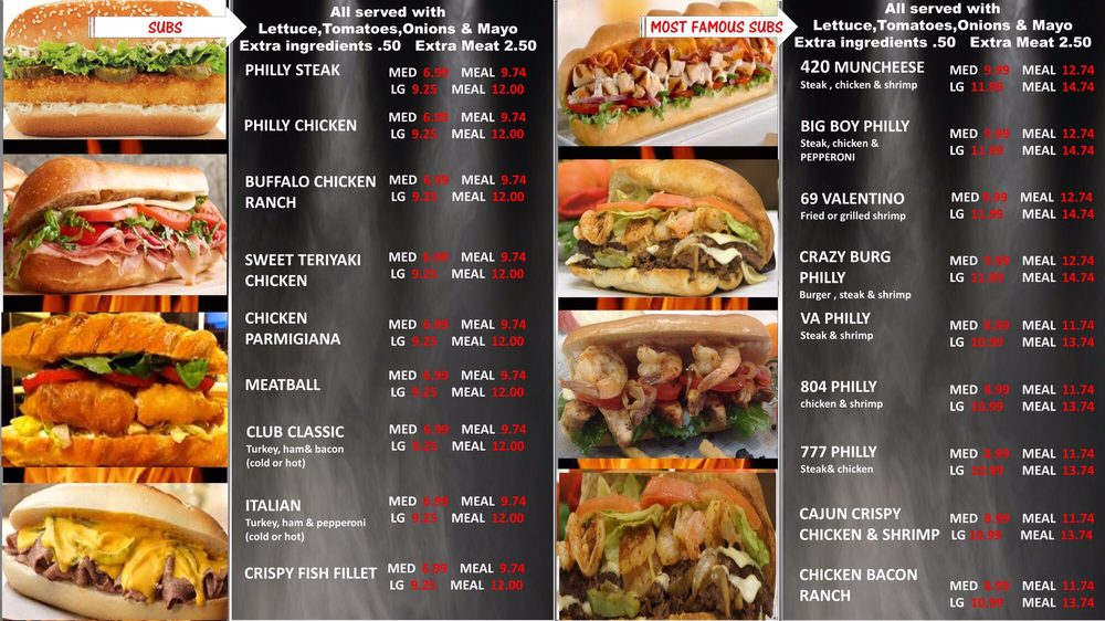 Burger, steak & shrimp. All served with lettuce, tomatoes, onions & mayo.